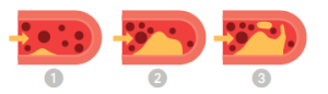 Potom nastaje aterosklerotski plak. Prvo se LDL- kolesterol infiltrira u stijenku i oksidira. Stanica pod nazivom makrofagi je zadužena za eliminaciju. Ta stanica, puna LDL-kolesterola (“stanica spužva”) malo po malo se nakuplja na stijenci arterije formirajući masnu nakupinu i uzrokujući upalne procese. Naposljetku ta masna nakupina prelazi u fibrozno tkivo i razvija se aterosklerotski plak.